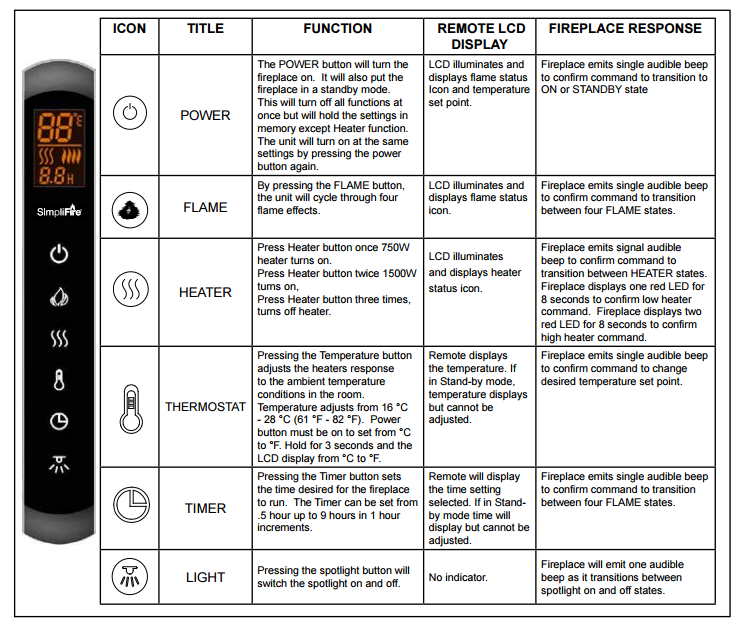 • Intuitive, multi-function remote included with all SimpliFire fireplaces allows flame and heat control